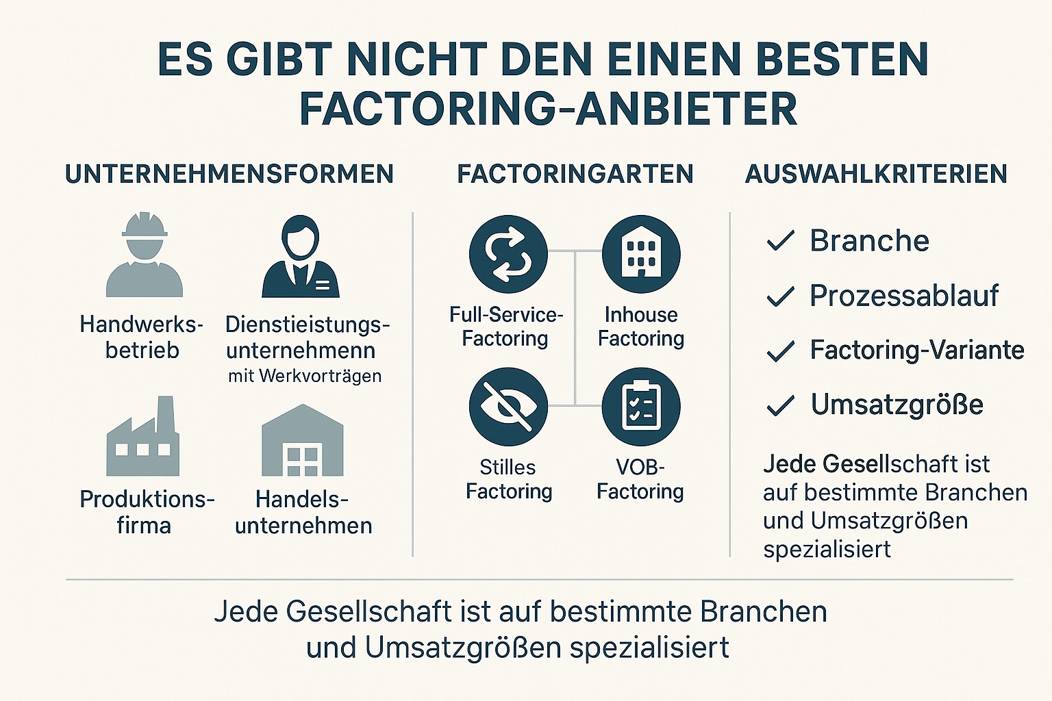 Gerade weil viele Unternehmer zunächst nur auf die schnelle Liquidität schauen, werden die Unterschiede in der vertraglichen Ausgestaltung und evtl. zusätzlichen Dienstleistungsfunktionen oft unterschätzt. In der Gesamtbetrachtung sollte neben den reinen Kosten auch immer die Bedarfsdeckung des Unternehmens berücksichtigt werden.