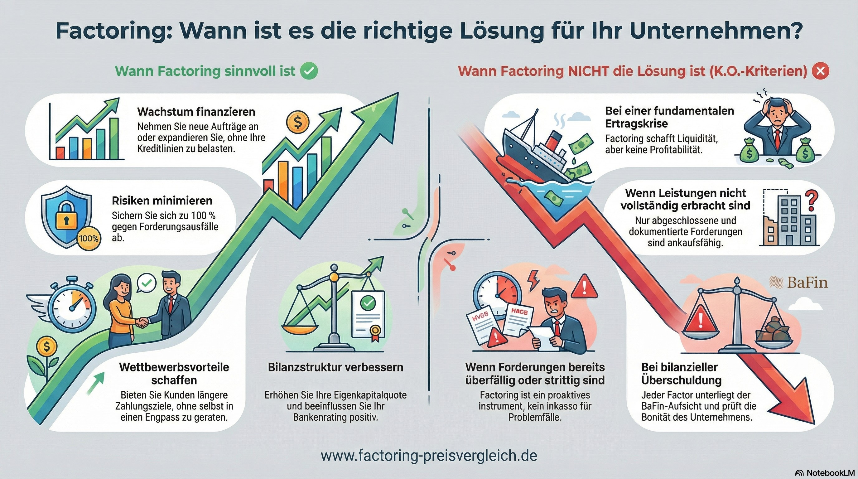 Zu den wichtigsten Punkten zählen Kosten, Anforderungen an saubere Rechnungen und Einschränkungen bei bestimmten Geschäftsmodellen oder Forderungsarten.